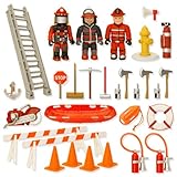 Features 3 firemen, contains 30 accessories including ladder, road blocks, rescue bed, fire hydrant, hoses, tools and much more.