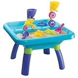 (More customer reviews)I bought this for my 17 month old son because he loves water and things that spin. I looked at a few sand and water tables & settled on this one because of the spinning accessories (they all seemed pretty similar otherwise) Comprably, the price was pretty good, too. I must say, we are really pleased with this purchase. Not only does my son LOVE it, but I found it very well made. Its really easy to put together (no tools needed!) but still nice & sturdy. It's also lightweight and easy to store. The entire table breaks down for compact storage. The table has two deep sections (so far we've used both for water- maybe we'll do sand in the future) Its a nice height for toddlers, and it comes with some really cute accessories. The scoops are perfect for little hands and the accesories are sturdy, too. They have withstood some abuse from my son. It has a sectional lid, so you could have one side covered while leaving the other open, or cover both. The lid fits nicely and has a little road design on top, so when not used for messy stuff, it could also serve as a play surface. Overall, I'm very pleased. I think its well worth the price. Its not cheap, for sure (considering its just molded plastic) but I learned pretty quickly that kids stuff is just expensive- even the junk- so I guess my expectations were low ;) . We try not to overindulge our son with 'stuff', but felt a toy like this would serve a multi-educational purpose, so we splurged. Pleased to say we weren't disappointed.