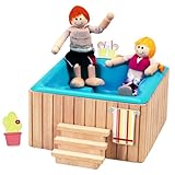 No dollhouse would be complete without a hot tub! This Splashing Good Time set from Small World Toys? Ryan's Room has a tub with a glossy interior, just like the real thing and comes with two posable wood-and-fabric family affair dolls with yarn hair and cute cloth bathing suits, For imaginative fun, not for use with water. Tub made from rubber wood. Ages:3 + Manufacturer: Small World Toys