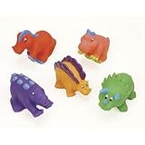 Description: 10 months & up. Five colorful dinosaur buddies that are soft and squeezable. They are great in a block area or for water play. All have cute faces and features that children will adore. Perfect size for small hands.