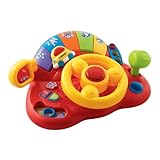 (More customer reviews)This toy has limited interest for my son. I bought it for him when he was 18 mos (he is now 2). He occasionally plays with it for maybe 5 minutes at a time. If you put it on a smooth surface (table, hardwood floor) it slides around when he tried to turn the wheel or pushes/pulls the gearshift. Also it is very LOUD and I find the tone of voice kind of rude: On the horn: "out of the way", on the gas button "fill er up" - but the tone of voice isn't nice it sounds like a rude little kid demanding that he be listened to....NOW. Except for the police button which says "slow down little fellow" the rest of them sound like spoiled brats! Not recommended.