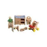 A nursery for toys and tots. A place where baby can play, eat, sleep, and get diapers changed. Nine-piece set includes: baby, stroller, crib with bedspread, highchair, changing table with pad, baby gym, and toy train.