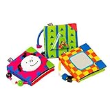 (More customer reviews)Our daughter has been playing with these books from her 9th month. She has one in her crib, one in her playard, and one in the car. The colours used attract an infant's eye, which is really great. Some pages crinkle, some squeak. There are three in a box so the baby doesn't get bored of them. All three have three pages, handles that have toys on them, and each page has an image front and back. Our daughter is almost 1 now and she loves to read us stories from her books. It's her moment to read to us, it's fun.