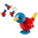 (More customer reviews)Our daughter is 11 months old so she still hasn't figured out how to use this whistle but us adults get a kick out of it. We have also bought other horns (tommy toot and one man band) from this company and are very satisfied with the quality. The best part about this toy is that its a basic horn when you blow into the tail, but if you fill the body up with water and blow into it, it literally sounds like a bird chirping. I don't know how they figured out how to make a water-filled bird-whistle but it is the coolest thing. We play with it in the bath. I'm sure when our daughter reaches the age the toy is intended for she will be able to use it herself.