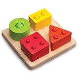(More customer reviews)Bright, durable, eco-friendly toy! Our 14 mo just got it as a gift. She loves taking off the shapes and putting them down on pegs. We count and name shapes:)This is a quality toy. Feels nice when holding those shapes,pegs are durable-do not fall out as in other similar toys. Great buy!!!